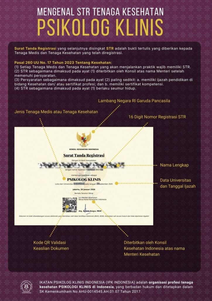 Surat Tanda Registrasi (STR) Psikolog Klinis diterbitkan oleh Konsil Kesehatan Indonesia atas nama Menteri Kesehatan karena Psikolog Klinis adalah Tenaga Kesehatan sesuai UU No. 17 Tahun 2023 Tentang Kesehatan. Sementara itu Psikolog Umum bukan tenaga kesehatan sehingga STR diterbitkan oleh HIMPSI sebagai Induk Organisasi Profesi Psikologi sesuai UU No. 23 Tahun 2022 Tentang Pendidikan dan Layanan Psikologi.